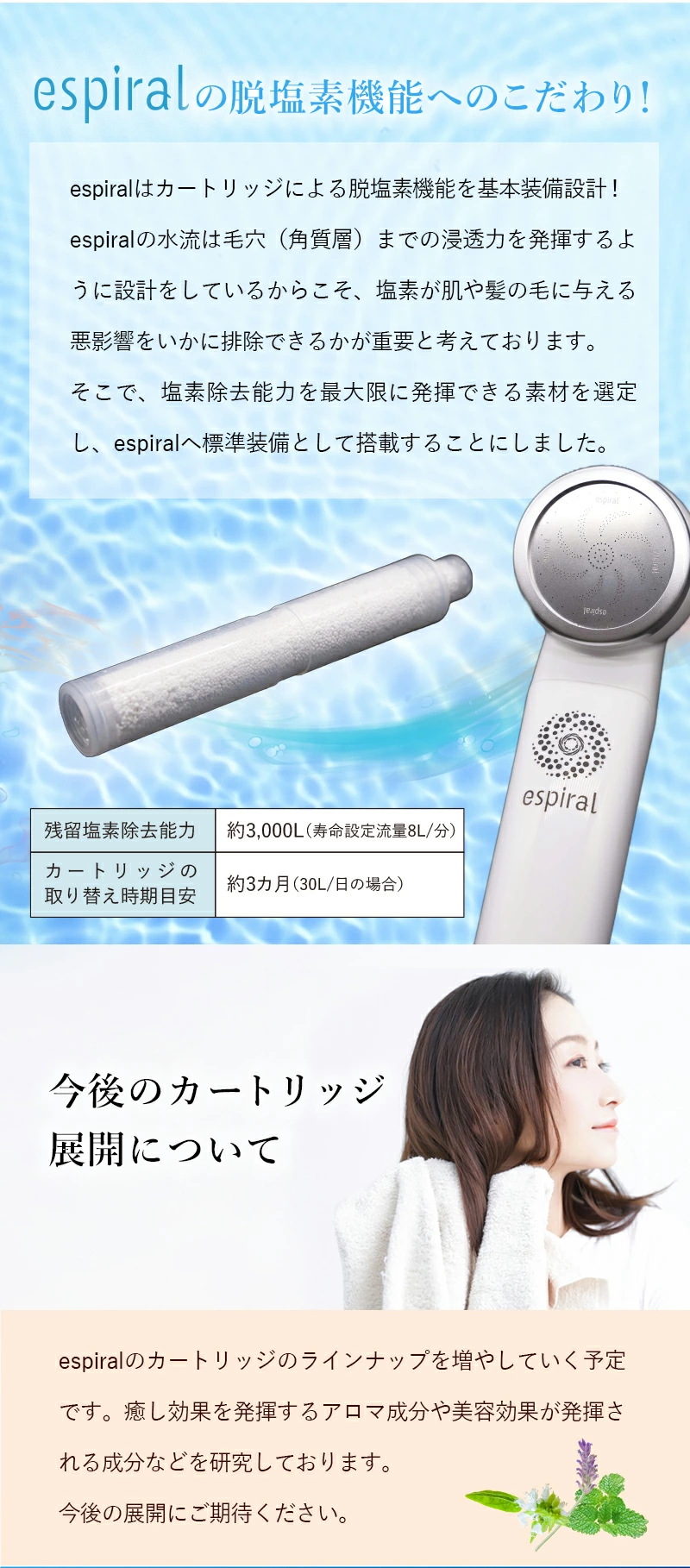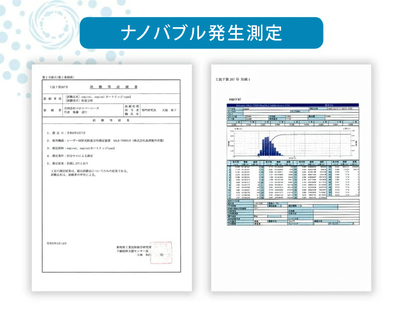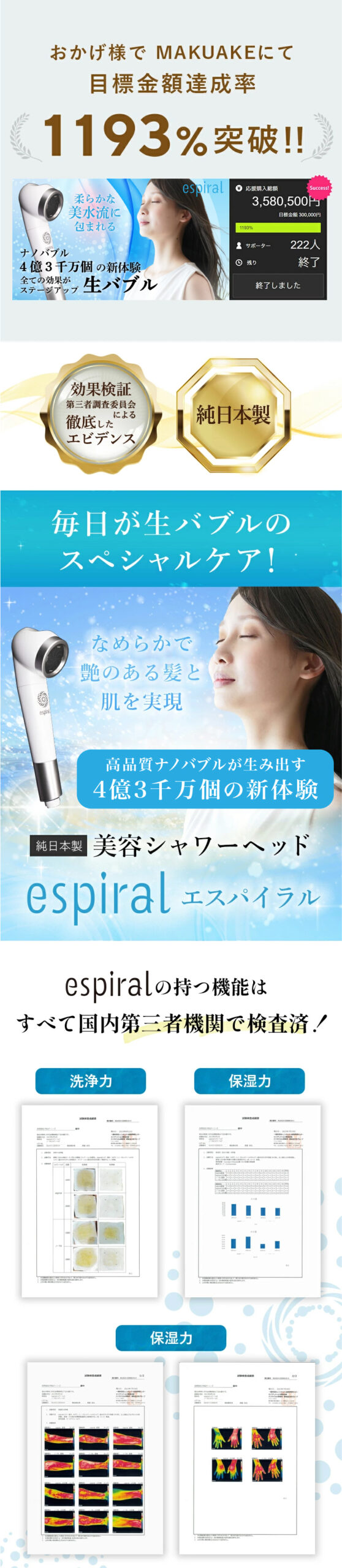 純日本製のシャワーヘッドのespiralは、4億3000万個のナノバブル発生機構を搭載しており「生バブル」を体験いただけます。