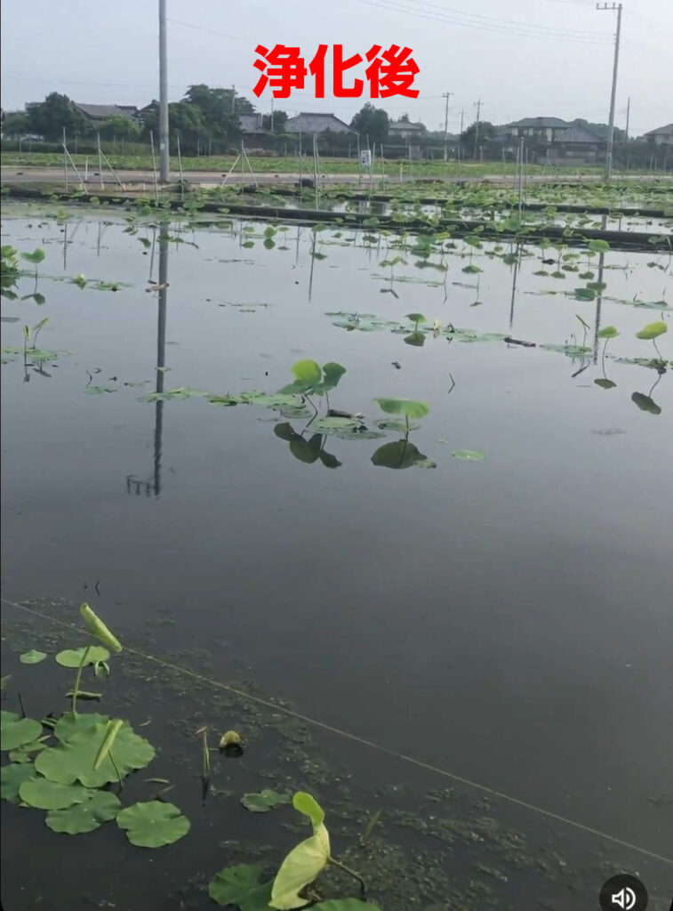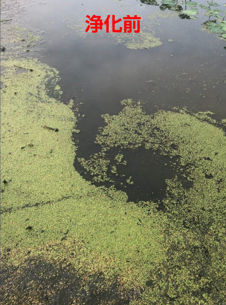 溶存酸素量の不足によって水質汚濁した池や沼に大量のナノバブルを送り込むことにより、好気性微生物の活動を活性化させ、水の浄化を実現します。
